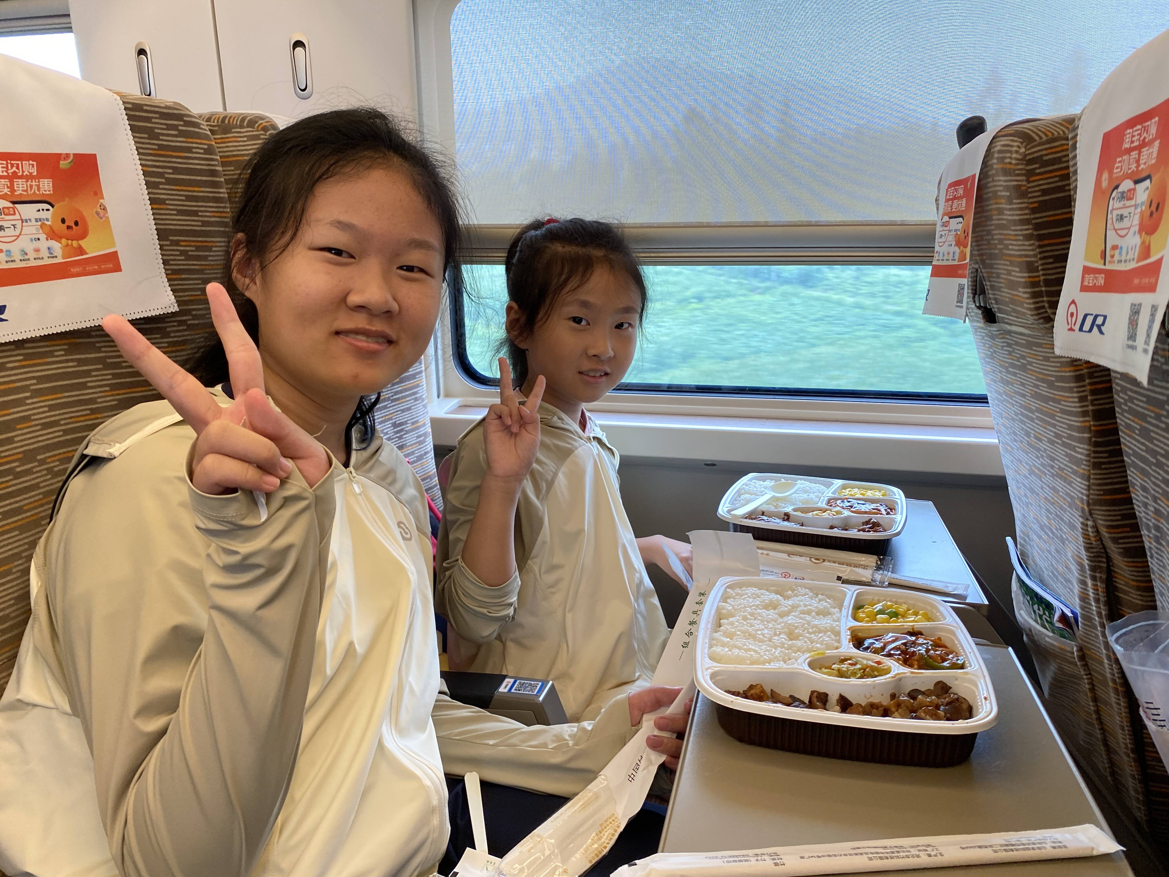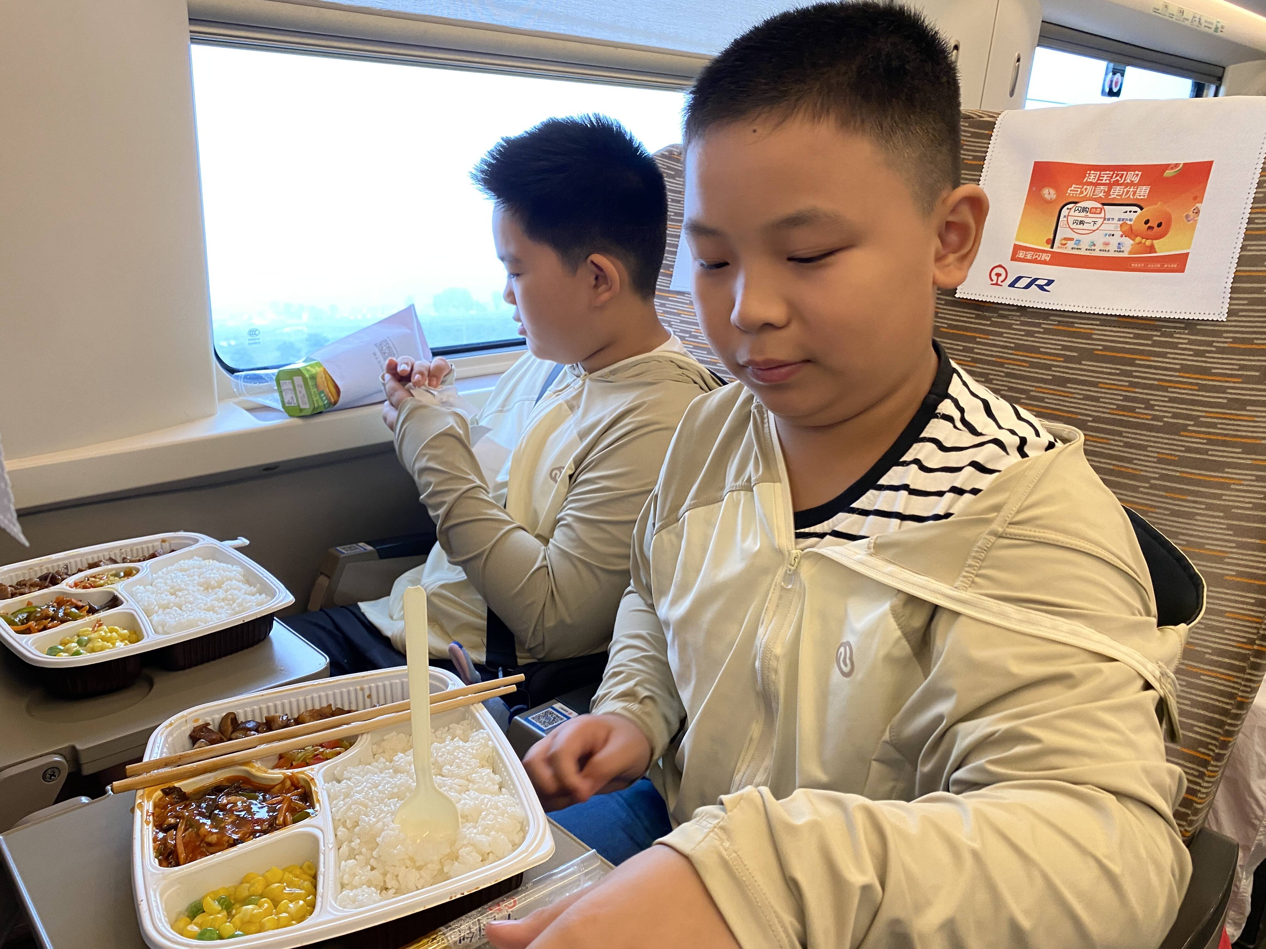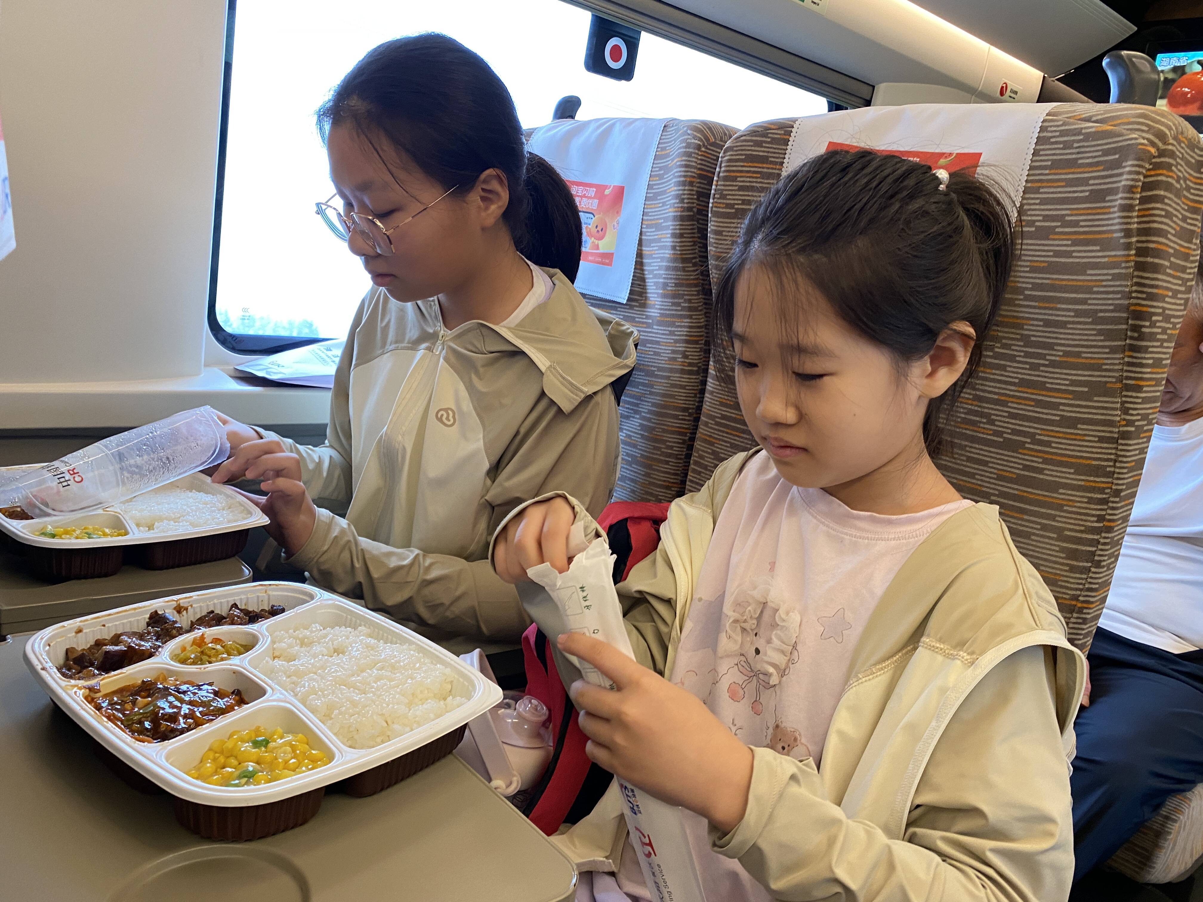 和同伴互相认识一下,迅速成为同行路上的好伙伴,大家坐在南下的列车上,先来一顿高铁餐补充体能吧!